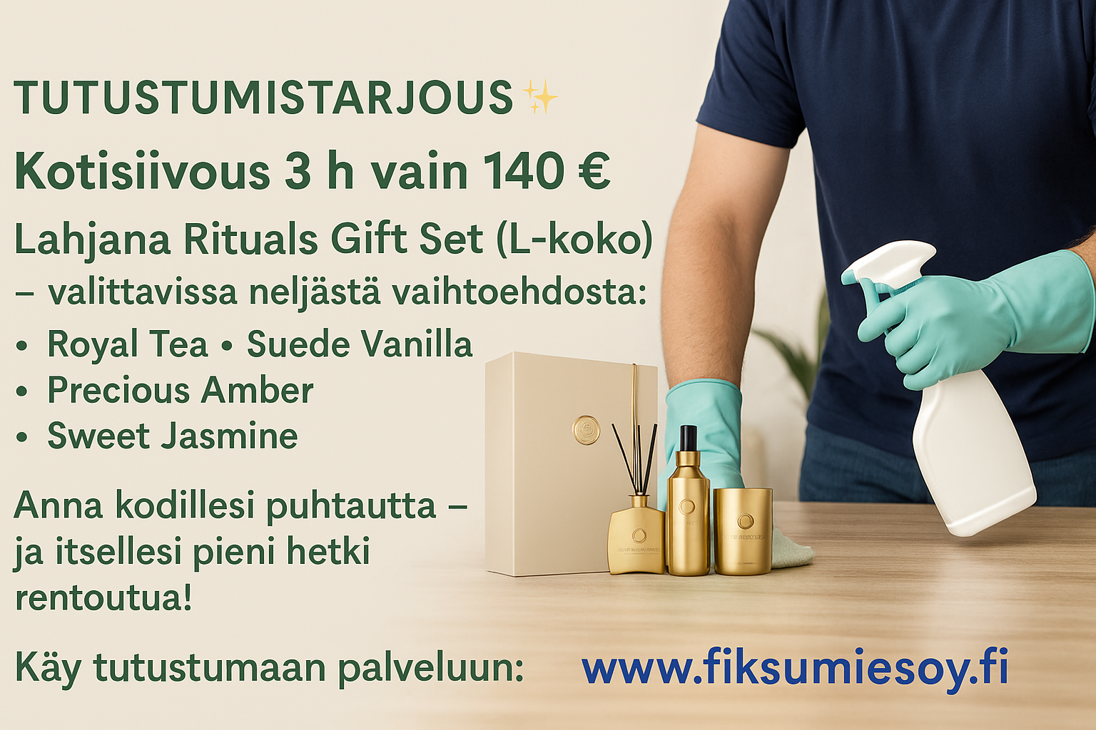Voit tilata pelkän kotisiivoukseen tai kotisiivouksen+pienet korjaukset, valinta on sinun.
